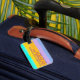 This lightweight acrylic identity tag for luggage, backpack, or even purse is sporting five pastel colour stripes in horizontal pattern with a template initial letter monogram. Fill in the template fields or click customise to select a typeface style, size, and colour you like.