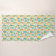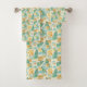 A Beautiful Coloured Bath Towel Set In Greens And Yellows With A Pastel Pattern Of Tropical Sea Shells And Palms.