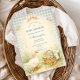 A charming storybook-style baby shower design featuring a sweet watercolor goose standing beside a nest filled with pastel eggs. Delicate spring flowers and soft greenery create a gentle countryside scene, while a blush bow and sage gingham background add a cozy cottagecore touch. The vintage illustration style and soft pastel palette give this design a whimsical nursery feel, perfect for a playful and heartwarming baby celebration.