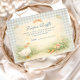 A charming storybook-style baby shower design featuring a sweet watercolor goose standing beside a nest filled with pastel eggs. Delicate spring flowers and soft greenery create a gentle countryside scene, while a blush bow and sage gingham background add a cozy cottagecore touch. The vintage illustration style and soft pastel palette give this design a whimsical nursery feel, perfect for a playful and heartwarming baby celebration.