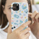 A cute pastel summer beach pattern phone case featuring playful ocean icons like seashells, fish, floaties, ice cream, sunglasses, and tropical elements.