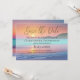 Save the Date Wedding Card features beautiful elegant pastel colours of the sunset on the beach. Turquoise blue, purple, and orange sunset ombre colours create an astounding blend of tropical shades for a beach, ocean, cruise or sunset wedding theme. Wonderful idea for planning a paradise beach wedding ceremony at an island resort with this lovely design. Mountain silhouette, glistening sunrise sunset at dusk, with gentle waves and beach sand on the ocean shore, perfect for a destination, island, tropical paradise coastal nautical event. Share your coastal hawaii, california, caribbean island or tropical beach wedding.