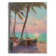 Sink into seaside serenity with this pastel sunset notebook, where hammocks sway gently between palms and café tables overlook a glowing turquoise sea. It’s the perfect retreat for your thoughts—romantic, restful, and kissed by ocean breeze. Ideal for daydreamers and slow-sunset scribblers.