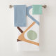 This towel set has a seafoam green washcloth, a blue hand towel, and a bath towel with a mid-century modern design of rounded triangles with white centres and ovals in the middle. Want different colours? Message me.