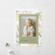 Happy Easter holiday photo card featuring a soft and elegant Easter-themed template. It features a pastel green rectangular frame in the centre with space to add a customisable photo. "Happy Easter" written in a delicate cursive font at the bottom and customisable signature below. Surrounding the frame are beautifully illustrated spring flowers, including tulips, daffodils, and other blooms, painted in light pinks, yellows, and whites with green leaves. The overall style is light, fresh, and festive, perfect for creating a card or invitation for Easter celebrations. Reverse left blank to provide space for a personal note.