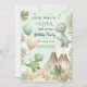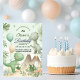 This invite features adorable cartoon dinosaurs, tropical leaves, a volcano, balloons, and confetti in soft sage green, sky blue, and neutral beige — all in a watercolor illustration style with a minimalist layout.