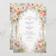 Invite your guests with a soft, romantic fine-art watercolor design featuring an airy floral arch overflowing with blush roses, peach blooms, lilac accents, delicate wildflowers, and fresh sage greenery. The composition frames the text with a light, hand-painted feel; transparent washes, gentle layering, and botanical details that look like a garden illustration on bright white paper.