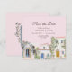 Square wedding save the date featuring beautiful mediterranean inspired watercolor illustrations paired with elegant script and serif fonts in which all your personalized information is written in. You can find more matching products from this stunning wedding collection in our store.