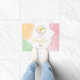 Colorful Easter design featuring Destei's watercolor illustration of a yellow baby chick nestled inside a willow wreath. The wreath is decorated with colorful pastel Easter eggs. The background includes lovely watercolor splashes in light orange, green and pink. The text sections appear in different pastel tones, enhancing the overall pastel theme. Three pastel Easter eggs sit along the bottom as an additional detail. Personalize with custom family name!