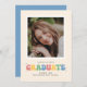 This fun retro inspired graduation announcement features the word graduate written in pastel pink, yellow, green, and blue. It has space for a photo on the front as well as the back. The back also includes space for more text.
