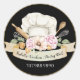 Watercolor baker pastry chef product label stickers, pink on black, featuring a name and title banner and bakers tools and chef hat with floral touches and a gold border. Whimsical illustrative style.