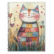 Watercolor Patchwork Valentine Cat in a field of heart flowers.