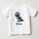 This personalised baby t-shirt features a cute T-Rex dinosaur that looks like it is crafted from stitched denim patches in various shades of blue, giving it a charming, handmade patchwork look. Embroidery-style details like button eyes, tiny stitches, and soft, worn edges add a cosy, vintage feel.