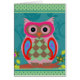 Multi-coloured, cute polka dot patchwork owl stood on a flowering tree branch with an ornate blue background and green polka dot borders.