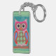 Multi-coloured, cute polka dot patchwork owl stood on a flowering tree branch with an ornate blue background and green polka dot borders.