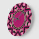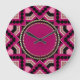 Geometric patchwork art pattern in pink shades and black. Matching hot pink centre circle with gold dot trims to enhance the clock hands plus also perfect space for you to personalise with text, if you desire.