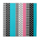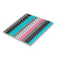 Patchwork made of multi-coloured strips of fabric in pink, blue and black and white.