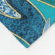 Gilded linework manta rays floating above a richly patterned and textured patchwork background. Sapphire blue, turquoise, teal and golden yellow.