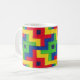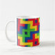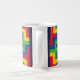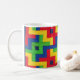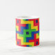A white coffee mug with a colourful, abstract design from a patchwork cot-quilt by Judy Adamson.