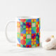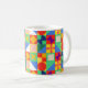 This mug has a Bauhaus design of squares with odd shapes inside, repeated across the design.