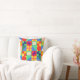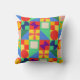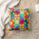 This throw pillow has a Bauhaus design of squares with odd shapes inside, repeated across the design.