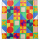 This shower curtain has a Bauhaus design of squares with odd shapes inside, repeated across the design.