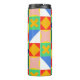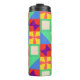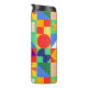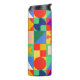 This thermal bottle has a Bauhaus design of squares with odd shapes inside, repeated across the design.