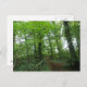 This stunning postcard features a photograph taken in a forest in England. The beautiful trees glow with an intense green as they reach up towards the sky. A small path winds its way deep into the woods surrounded by tall trees.