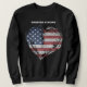 A ladies American Flag Patriot Sweatshirt with heart shaped American Flag and message: Forever Strong. Casual sweatshirt with patriotic message. Shown in Black.