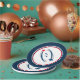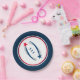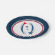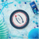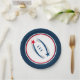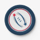 Colourful rims circle the plate with a white background and a modern art football graphic/logo with stars on it. Seven inches in size and made of paper. Customise or buy as is.