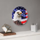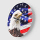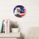 A gorgeous wall clock for proud patriotic Americans! A bald eagle sits in front with the stars and stripes of the American flag in the back, and minimalist white hour markers around the outside. Would look great on in the office, home or business!