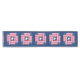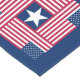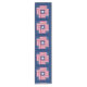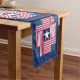 Patriotic table runner has quilt style pattern of the American flag. Each section consist of four flags arranged in a square with a white star in the centre and all on a blue background. Makes a great decoration for 4th of July BBQs, Memorial Day dinners and Veterans Day celebrations.