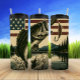 A large bass leaps vigourously from the water, hooked by a fishing lure, set against a backdrop of a distressed American flag. Below, a serene lake is flanked by pine forests and distant mountains, creating a composite image celebrating American outdoor sports and nature.