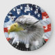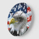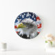Custom Wall Clock has close up photo of Bald Eagle in front of the American Flag.