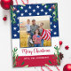Send Merry Christmas greetings to friends and family with this unique USA American Flag Christmas Card - USA American flag design modern red white blue design with holly and berries. Personalise with your favourite photo and family name. This patriotic Christmas card is perfect for military families, veterans, patriotic family christmas cards. COPYRIGHT © 2022 Judy Burrows, Black Dog Art - All Rights Reserved. Patriotic Christmas Military Photo American Flag Holiday Postcard