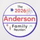Row 1 - Design features the year in large blue text with family name in red displayed across front. Design is featured against a white background and bordered with a bright red circle.