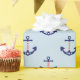 This wrapping paper features a pattern of nautical anchors in patriotic red, white and blue colours decorated with stars and stripes. Background is light blue.
