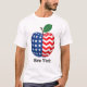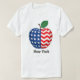This image features a stylised apple incorporating elements of the American flag. The left half of the apple displays a field of white stars on a blue background, while the right half shows red and white horizontal stripes arranged in a chevron pattern. A brown stem and a green leaf complete the apple design. Below the apple, the words "New York" are written in a simple, outlined font.