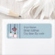 This patriotic Christmas address label has my drawing of ornaments hanging from ribbons. There is a heart shaped ornament with red and white stripes. The upper right corner is blue with white stars. There is a white ornament with tiny blue and red stars. And a translucent red ornament. The ribbons are light blue. On are on a light blue background with snow. Be sure to change the placeholder text to your own name and address.