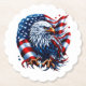 These paper coasters are shown in a patriotic July 4th stars and stripes eagle print design.