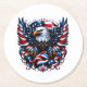 These paper coasters are shown in a patriotic July 4th stars and stripes eagle print design.