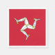 These paper napkins prominently display the flag of the Isle of Man, showcasing its distinctive triskelion symbol on a bold red field. The triskelion, with its three armoured legs joined at the thigh, symbolises resilience and determination, reflecting the island's motto "Quocunque Jeceris Stabit," which translates to "Whichever way you throw it, it will stand."