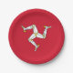 These paper plates prominently display the flag of the Isle of Man, showcasing its distinctive triskelion symbol on a bold red field. The triskelion, with its three armoured legs joined at the thigh, symbolises resilience and determination, reflecting the island's motto "Quocunque Jeceris Stabit," which translates to "Whichever way you throw it, it will stand."