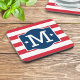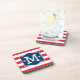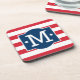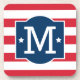 A bold patriotic monogram beverage coaster featuring a custom initial framed in navy blue against a classic red and white striped background. The stars and stripes-inspired design makes this perfect for Fourth of July celebrations, military homecomings, or year-round patriotic decor. A thoughtful personalised gift for anyone who loves Americana style. All text is fully customisable.