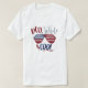 Show your Stylish vibes and American pride with this bold ' red, white and cool' tee- play on red, white and blue with american colors stars and stripes aviator glasses (Image: Mockup of man and woman model relaxing at 4th of July party wearing white t-shirt with red, white and blue American colors aviation glasses - Unisex design - Red, white & cool patriotic slogan t-shirt mockup).