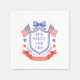 This patriotic bridal shower paper plate design features a watercolor crest with a light red white and blue patriotic crest with American flags and a blue bow. Text in the center of the crest says "Red, white and I do."