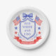 This patriotic bridal shower paper plate design features a watercolor crest with a light red white and blue patriotic crest with American flags and a blue bow. Text in the center of the crest says "Red, white and I do."