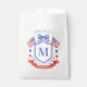 This patriotic bridal shower favor bag design features a watercolor crest with a red white and blue patriotic crest with American flags and a blue bow. ou can personalize with your monogram and name.