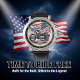 This distinctive watch face features a prominent American flag waving in the background, behind a detailed black motorcycle. Large, stylised wings extend from the motorcycle's side, with additional red and blue feathered wings at the bottom. The overall design emphasizes patriotism and a love for motorcycling, with clear silver numbers and watch hands for timekeeping.