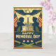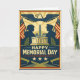 This Memorial Day design evokes the power and solemnity of a historic civic poster, honoring service across generations. Two silhouetted service members—one in a World War–era helmet and the other in a dress uniform—face one another in quiet recognition, representing continuity of duty and sacrifice. Between them rises a monumental memorial with an obelisk and classical structures, symbolizing national remembrance. Above, a broad-winged eagle soars through radiant sunburst rays, flanked by American flags that frame the composition. Laurel branches and stars reinforce themes of honor, valor, and eternal gratitude. Rendered in heritage blues, golds, and muted reds, the artwork conveys dignity, unity, and reverence.
